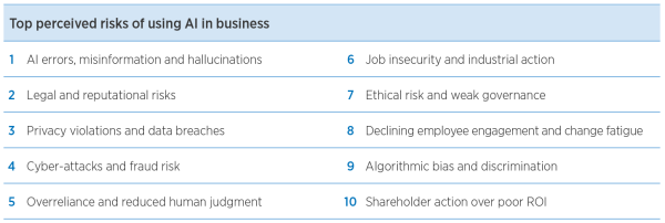 People-related risks also remain a top concern for business leaders in adopting AI. At least half of businesses see potential job insecurity as a side effect of AI transformation, alongside a drop in employee engagement and change fatigue. If left unaddressed, these issues could prompt reduced trust in leadership.