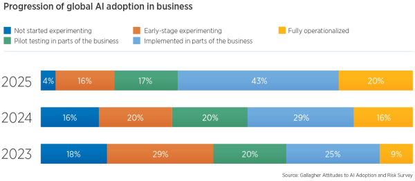 The 2025 Gallagher Adoption and Risk Survey showed that in the past 12 months, the rollout of AI adoption strategies has accelerated, with a much greater proportion of businesses (63%) now having either fully operationalised or implemented AI within parts of their business, a marked increase from 45% in 2024.